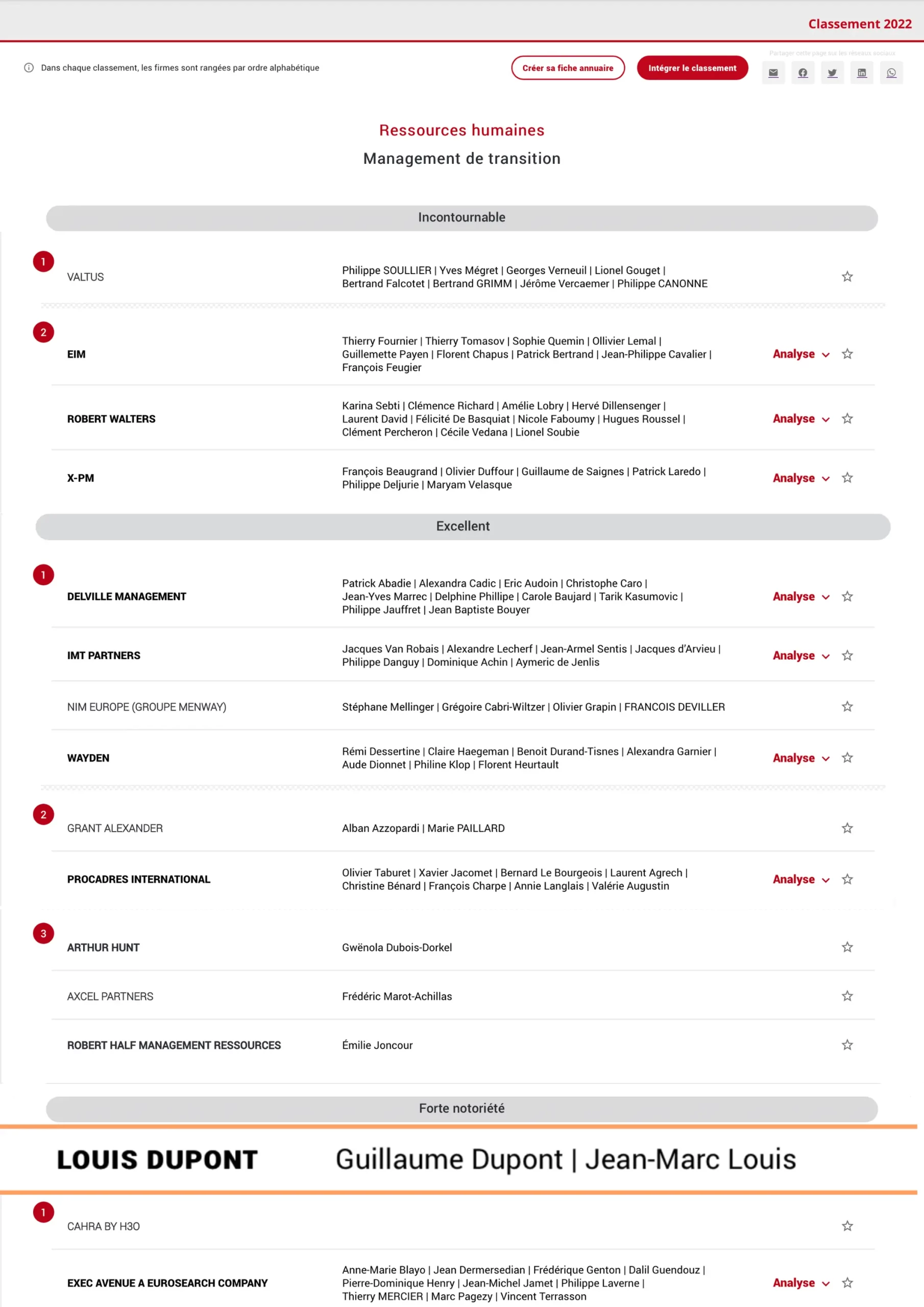 Chaque année, le Décideurs Magazine partage le Guide-Annuaire « Leadership & Management du Capital Humain », qui comprend des classements en fonction d’une analyse proche du terrain, compilée sur la base de critères qualitatifs — spécialité par spécialité. Le classement comprend 5 groupes : Incontournable, Excellent, Forte notoriété, Pratique réputée, Pratique de qualité.