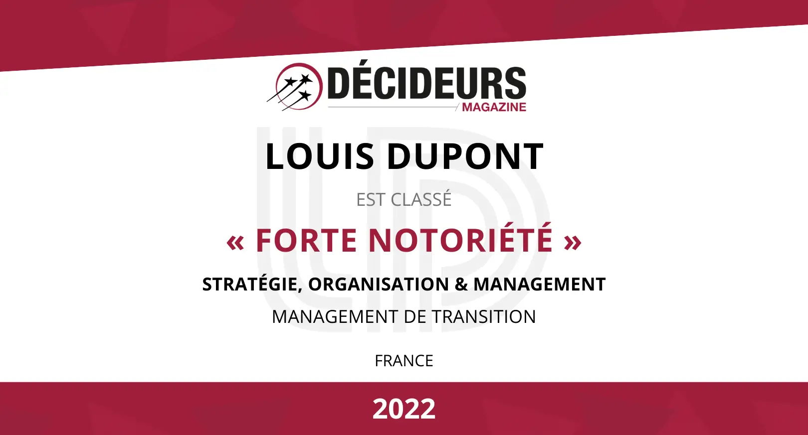 Pour la deuxième année consécutive, LOUIS DUPONT se distingue dans la catégorie « Forte notoriété » dans le classement 2022 des « Meilleurs cabinets de Management de Transition » de Décideurs Magazine !